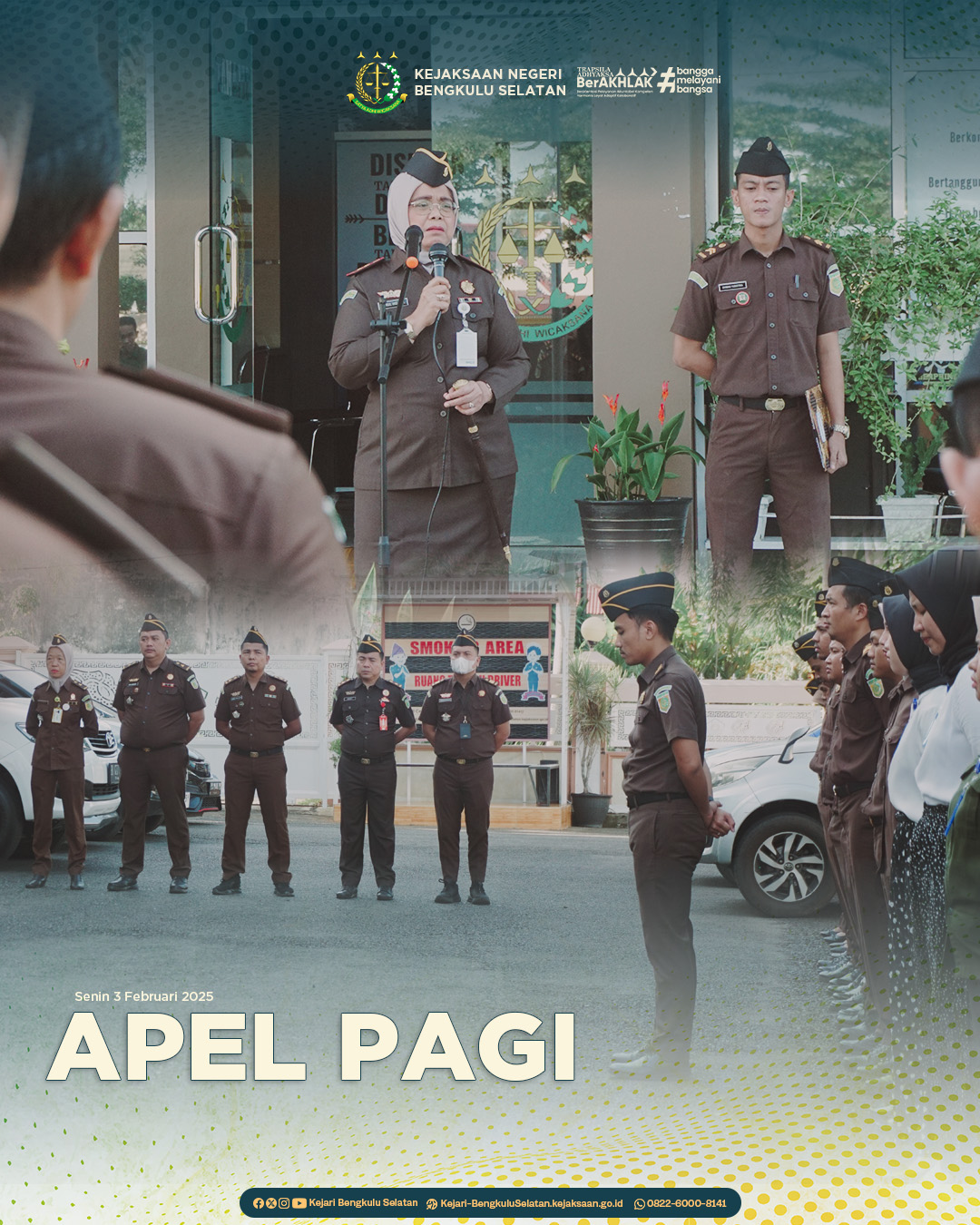 Apel Kerja Pagi hari Senin (3/02/2025) sore yang dilaksanakan di halaman kantor Kejaksaan Negeri Bengkulu Selatan. Bertindak sebagai Penerima Apel yaitu Kajari Bengkulu Selatan, S.H.,M.H. dan Pemimpin Apel yaitu Nandi Rizqi Syahputra,S.H.