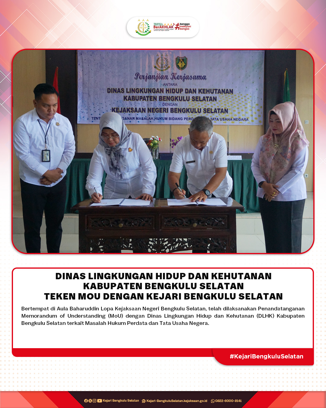 Rabu (22/1/2025) Bertempat di Aula Baharuddin Lopa Kejaksaan Negeri Bengkulu Selatan, telah dilaksanakan Penandatanganan Memorandum of Understanding (MoU) dengan Dinas Lingkungan Hidup dan Kehutanan (DLHK) Kabupaten Bengkulu Selatan terkait Masalah Hukum Perdata dan Tata Usaha Negara.