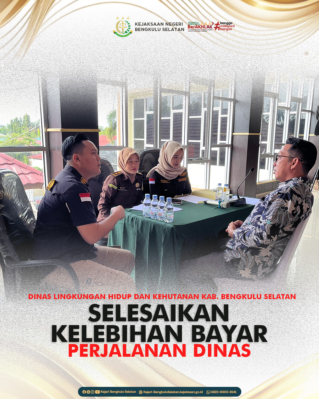 Dinas Lingkungan Hidup dan Kehutanan (DLHK) kabupaten Bengkulu Selatan mengembalikan kelebihan bayar perjalanan dinas (Perjadin) sebesar Rp98.146.359 (sembilan puluh delapan juta seratus empat puluh enam ribu tiga ratus lima puluh sembilan rupiah).