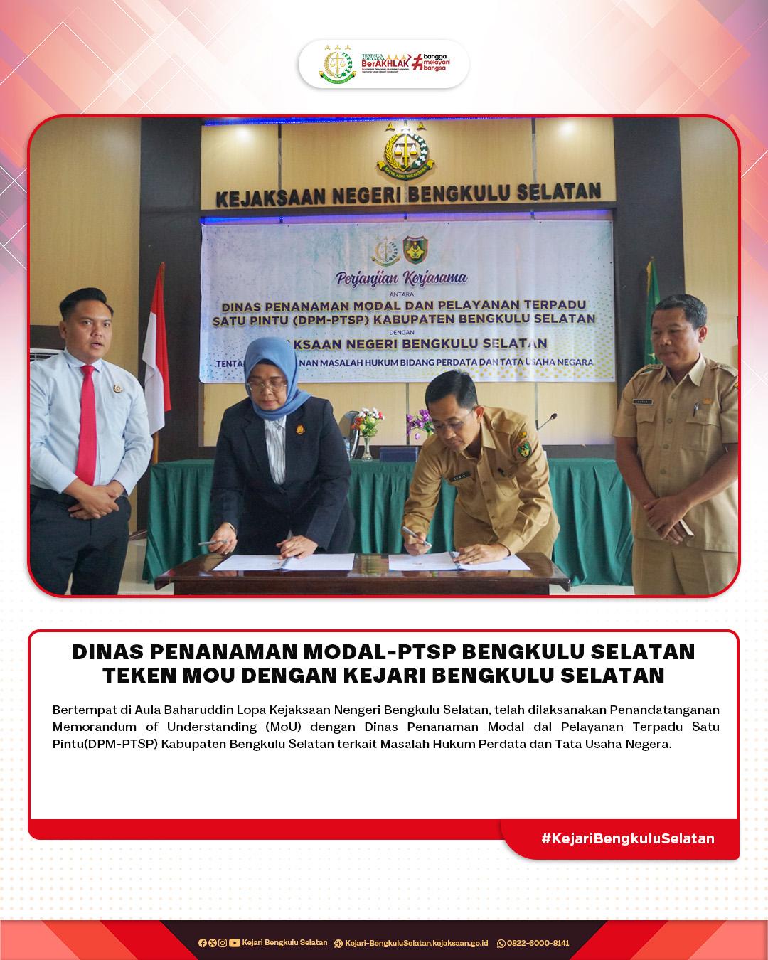 Bertempat di Aula Baharuddin Lopa Kejaksaan Nengeri Bengkulu Selatan, telah dilaksanakan Penandatanganan Memorandum of Understanding (MoU) dengan Dinas Penanaman Modal dal Pelayanan Terpadu Satu Pintu(DPM-PTSP) Kabupaten Bengkulu Selatan terkait Masalah Hukum Perdata dan Tata Usaha Negara.