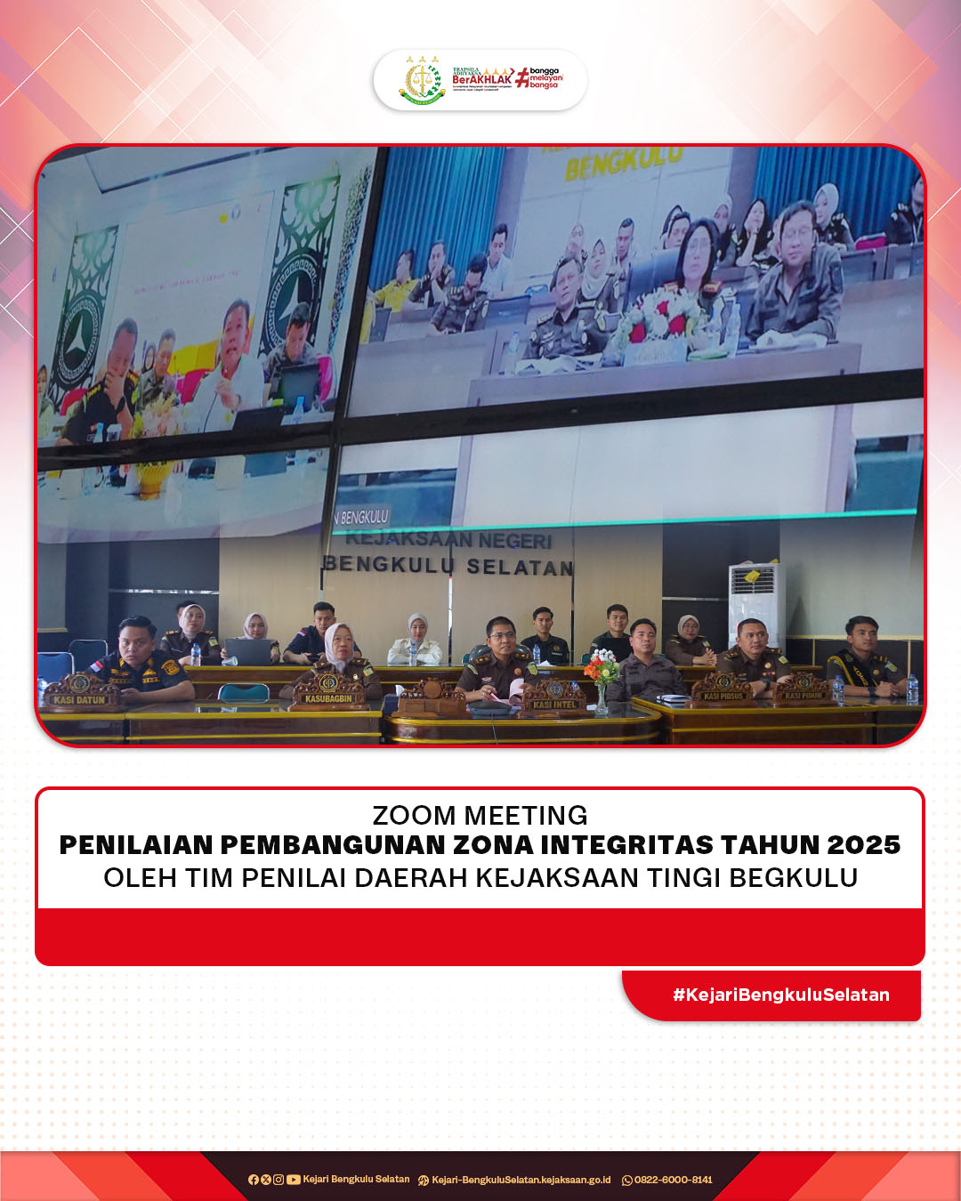 Bertempat di ruang Vicon Kejari Bengkulu Selatan, seluruh Kasi dan Kasubagbin serta staf, mengikuti penilaian dan evaluasi Pembangunan Zona Integritas (ZI) Menuju Wilayah Bebas Dari Korupsi (WBK) Tahun 2025 oleh Tim Penilai Daerah (TPD) Kejaksaan Tinggi Bengkulu.