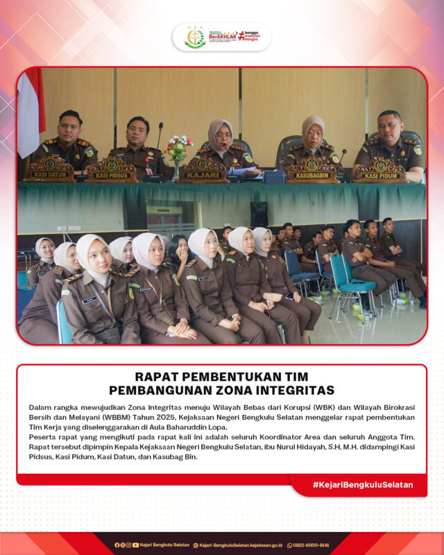Dalam rangka mewujudkan Zona Integritas menuju Wilayah Bebas dari Korupsi (WBK) dan Wilayah Birokrasi Bersih dan Melayani (WBBM) Tahun 2025, Kejaksaan Negeri Bengkulu Selatan menggelar rapat pembentukan Tim Kerja yang diselenggarakan di Aula Baharuddin Lopa. Peserta rapat yang mengikuti pada rapat kali ini adalah seluruh Koordinator Area dan seluruh Anggota Tim. Rapat tersebut dipimpin Kepala Kejaksaan Negeri Bengkulu Selatan, ibu Nurul Hidayah, S.H, M.H. didampingi Kasi Pidsus, Kasi Pidum, Kasi Datun, dan Kasubag Bin.