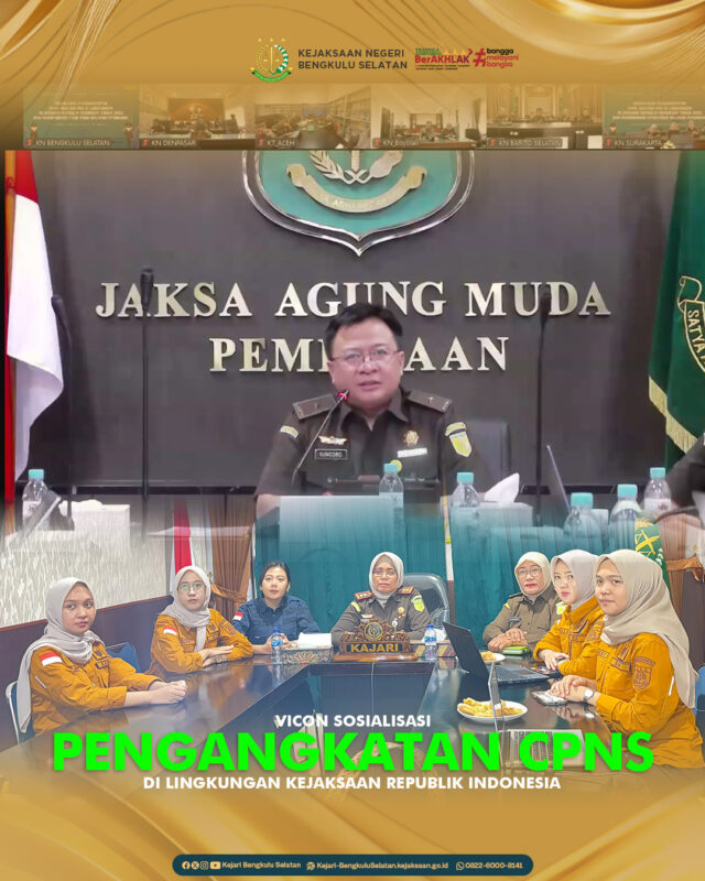 Kepala Kejaksaan Negeri Bengkulu Selatan beserta Kaur Kepgawaian dan CPNS mengikuti video conference di ruang Adhyaksa Command Center (ACC) mengenai Sosialisasi Pengangkatan CPNS menjadi PNS dilingkungan Kejaksaan Republik Indonesia Tahun 2025 dan Penambahan Fitur pada Aplikasi Mysimkari.