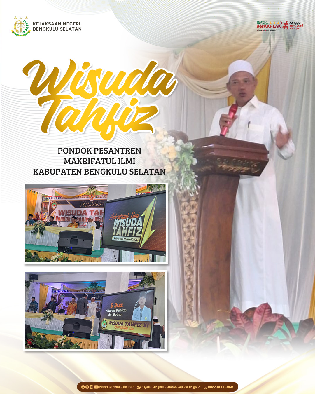 Home BERITA Wisuda Tahfiz Ponpes Makrifatul Ilmi BERITA Wisuda Tahfiz Ponpes Makrifatul Ilmi By admin - March 10, 2025 FacebookTwitterWhatsAppPrint Kasubagbin Kejari Bengkulu Selatan, ibu Agini Wesmayanti,S.H. menghadiri acara Wisuda Tahfiz di Pondok Pesantren Makrifatul Ilmi Manna Bengkulu Selatan.